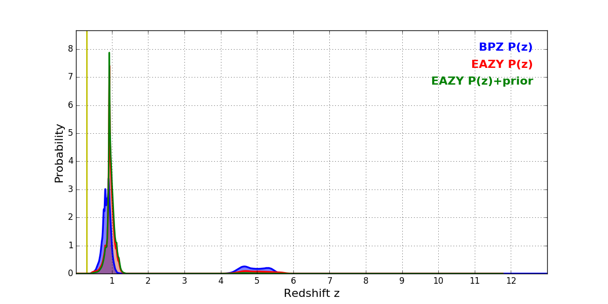 In P(z) plots: Yellow lines mark the cluster redshift z = 0.300,