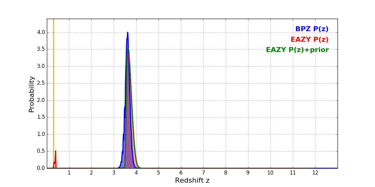 In P(z) plots: Yellow lines mark the cluster redshift z = 0.300,