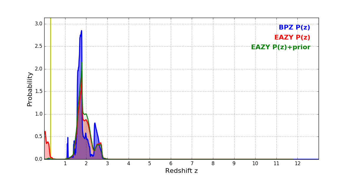 In P(z) plots: Yellow lines mark the cluster redshift z = 0.300,