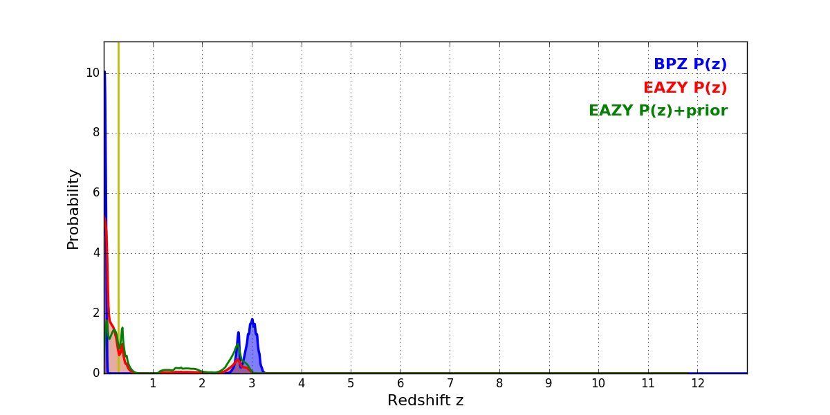 In P(z) plots: Yellow lines mark the cluster redshift z = 0.300,
