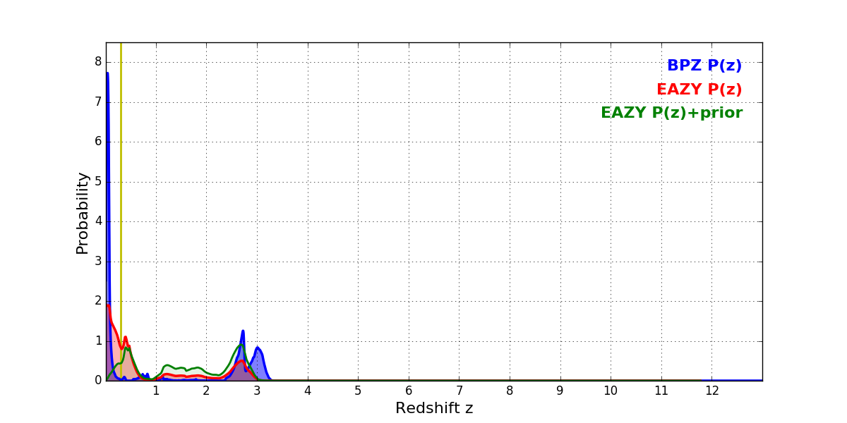 In P(z) plots: Yellow lines mark the cluster redshift z = 0.300,