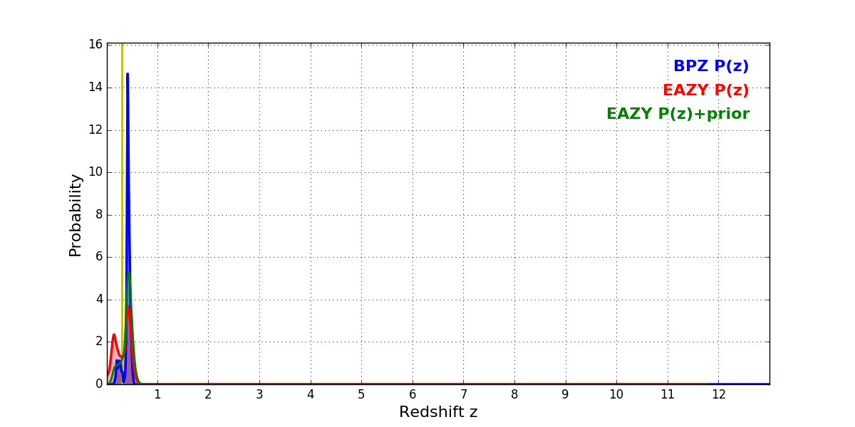 In P(z) plots: Yellow lines mark the cluster redshift z = 0.300,
