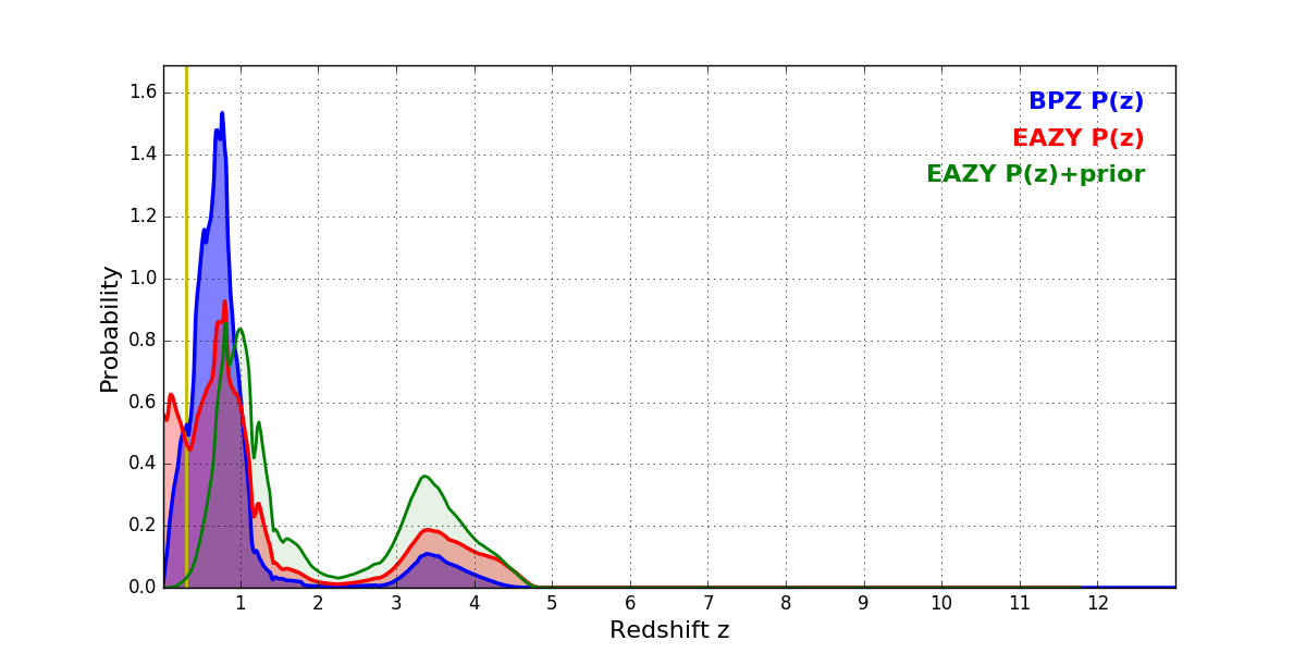 In P(z) plots: Yellow lines mark the cluster redshift z = 0.300,