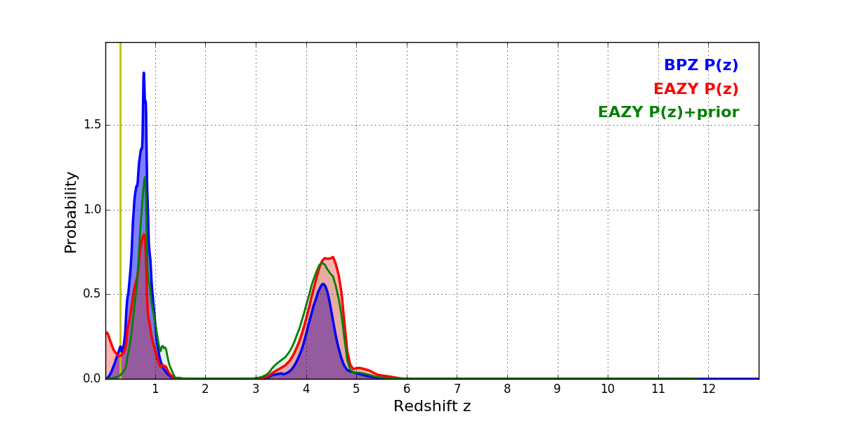 In P(z) plots: Yellow lines mark the cluster redshift z = 0.300,