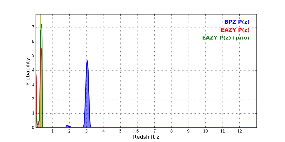 In P(z) plots: Yellow lines mark the cluster redshift z = 0.300,