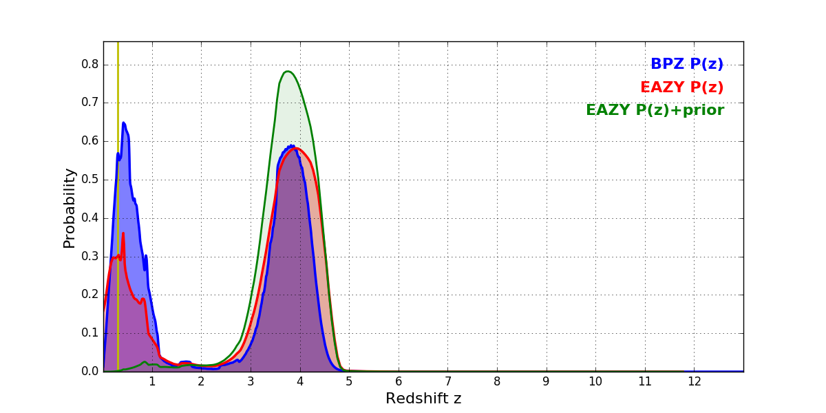 In P(z) plots: Yellow lines mark the cluster redshift z = 0.300,