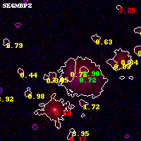 Object #15502 x,y = (4117, 5257) RA, Dec = (01:02:53.880, -49:14:06.36) = (15.72450, -49.23510) BPZ = 0.723 [0.662--0.994] type = 8.50 (SB2_B10 - SB1_B10) chisq2 = 0.27 ODDS = 0.89 z_cluster = 0.870