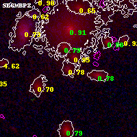 Object #17623 x,y = (4584, 4350) RA, Dec = (01:02:51.024, -49:15:00.72) = (15.71260, -49.25020) BPZ = 0.784 [0.575--0.937] type = 6.20 (Sbc_B10 - Scd_B10) chisq2 = 0.05 ODDS = 0.61 z_cluster = 0.870