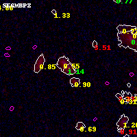 Object #18587 x,y = (3363, 4197) RA, Dec = (01:02:58.512, -49:15:09.72) = (15.74380, -49.25270) BPZ = 1.135 [1.075--1.172] type = 8.20 (SB1_B10 - SB2_B10) chisq2 = 0.09 ODDS = 1.00 z_cluster = 0.870