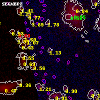 Object #6480 x,y = (2230, 2880) RA, Dec = (01:03:05.448, -49:16:28.92) = (15.77270, -49.27470) BPZ = 1.127 [0.091--2.005] type = 9.90 (SB3_B10 - SB2_B10) chisq2 = 0.35 ODDS = 0.20 z_cluster = 0.870