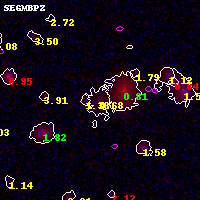 Object #8524 x,y = (2963, 3562) RA, Dec = (01:03:00.960, -49:15:47.88) = (15.75400, -49.26330) BPZ = 0.678 [0.549--0.802] type = 9.60 (SB3_B10 - SB2_B10) chisq2 = 0.16 ODDS = 0.72 z_cluster = 0.870