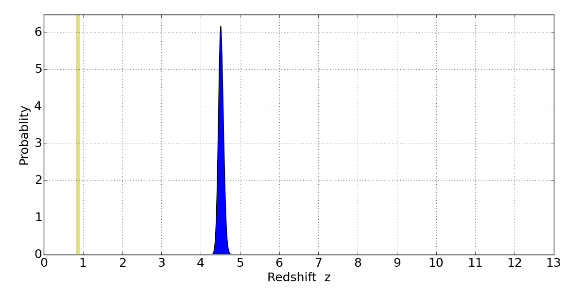 In P(z) plots: Yellow lines mark the cluster redshift z = 0.870,