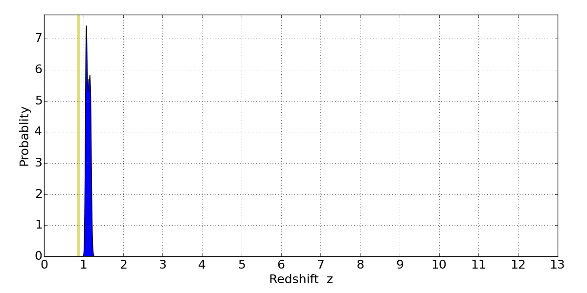 In P(z) plots: Yellow lines mark the cluster redshift z = 0.870,
