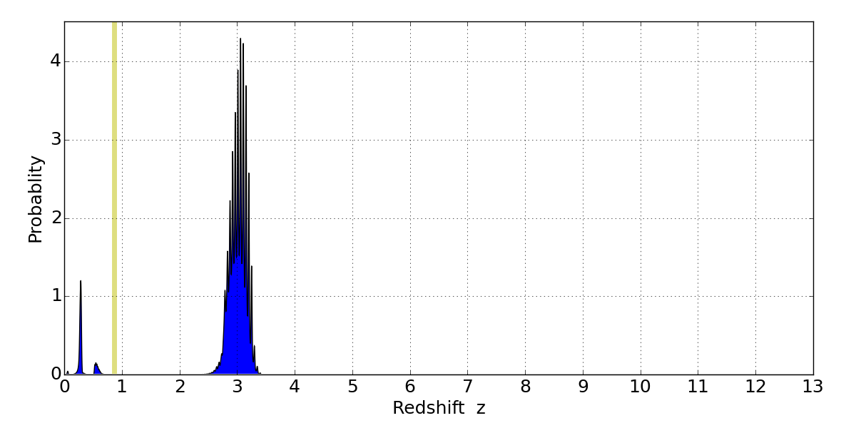In P(z) plots: Yellow lines mark the cluster redshift z = 0.870,