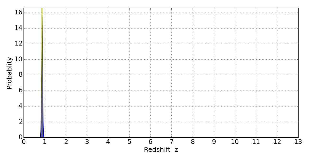 In P(z) plots: Yellow lines mark the cluster redshift z = 0.870,