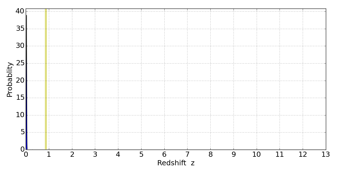 In P(z) plots: Yellow lines mark the cluster redshift z = 0.870,