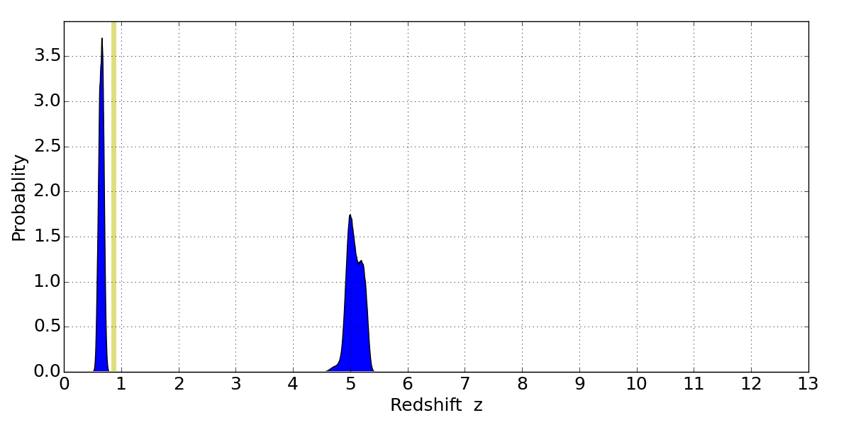 In P(z) plots: Yellow lines mark the cluster redshift z = 0.870,