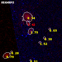 Object #1561 x,y = (2152, 3378) RA, Dec = (01:03:05.928, -49:15:59.04) = (15.77470, -49.26640) BPZ = 1.786 [1.396--1.873] type = 8.90 (SB2_B10 - SB1_B10) chisq2 = 0.26 ODDS = 0.45 z_cluster = 0.870