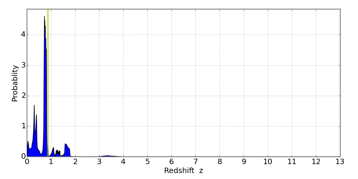 In P(z) plots: Yellow lines mark the cluster redshift z = 0.870,