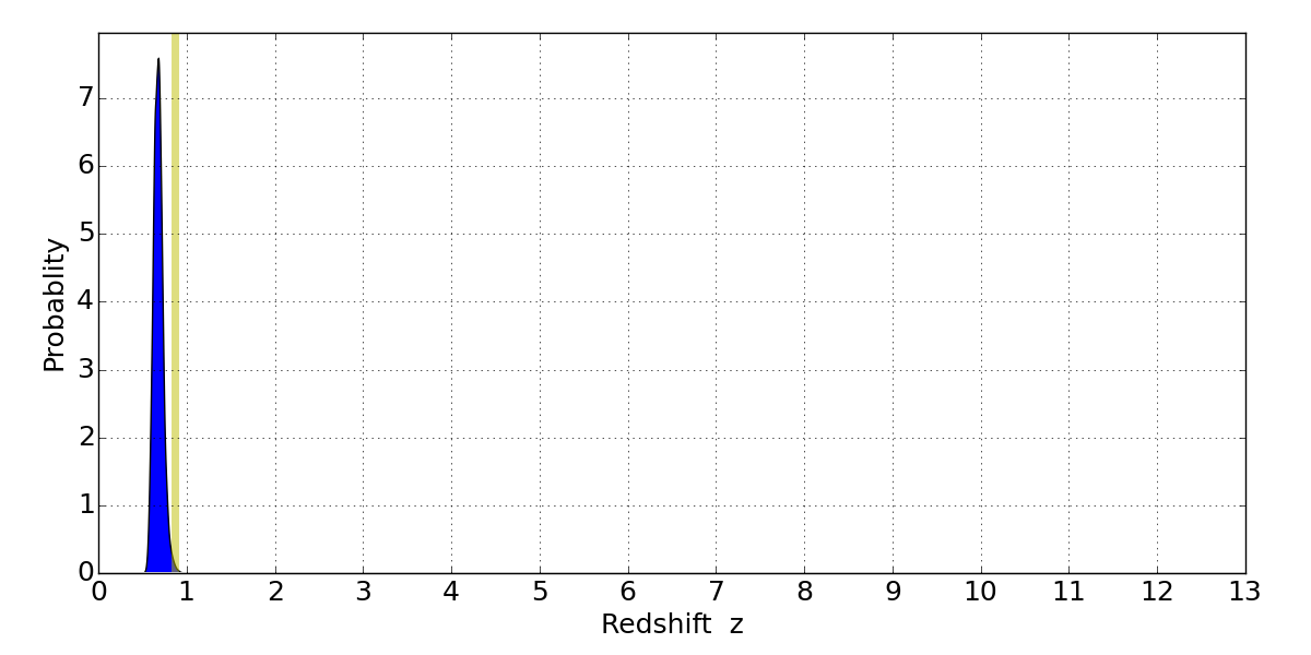 In P(z) plots: Yellow lines mark the cluster redshift z = 0.870,