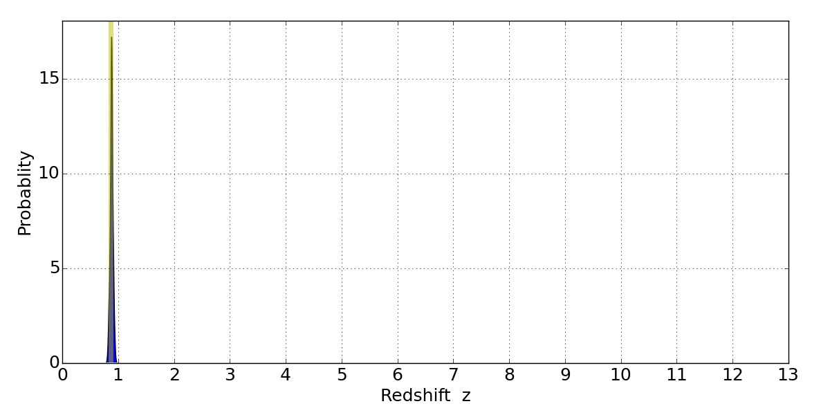 In P(z) plots: Yellow lines mark the cluster redshift z = 0.870,