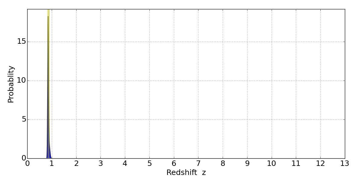 In P(z) plots: Yellow lines mark the cluster redshift z = 0.870,