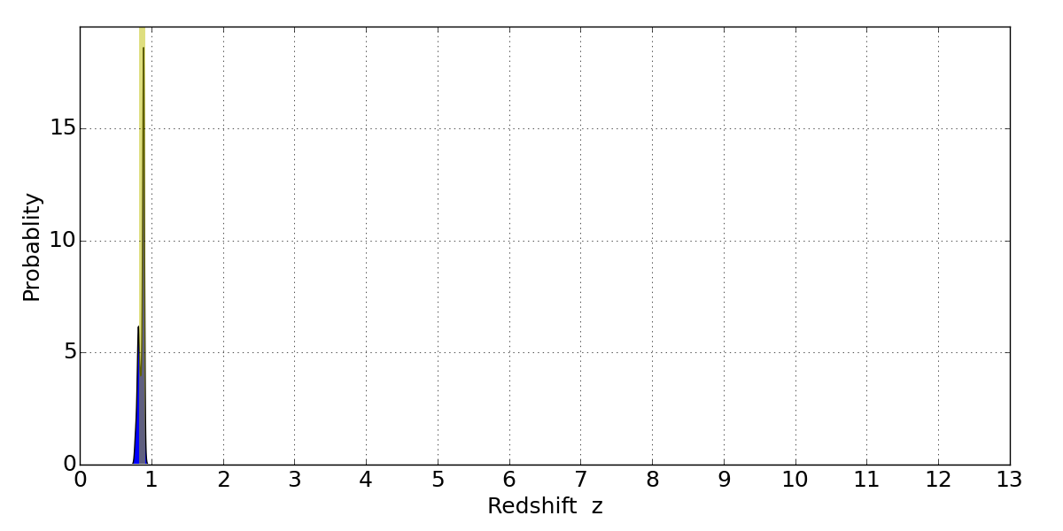 In P(z) plots: Yellow lines mark the cluster redshift z = 0.870,