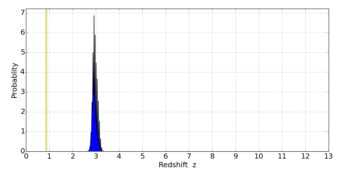 In P(z) plots: Yellow lines mark the cluster redshift z = 0.870,
