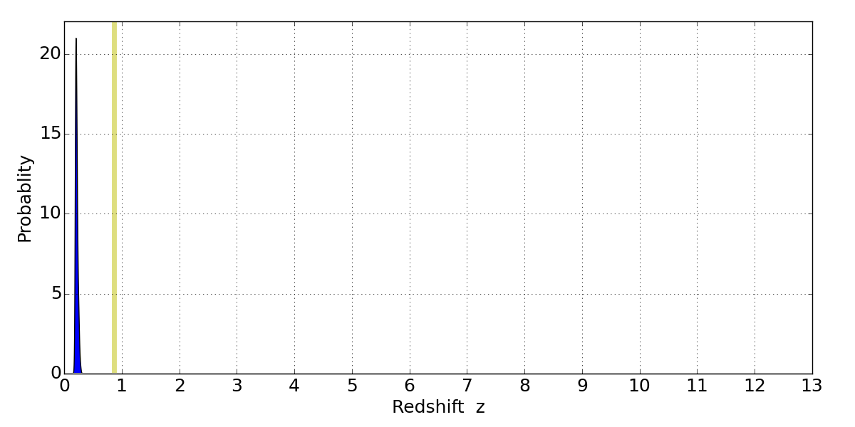 In P(z) plots: Yellow lines mark the cluster redshift z = 0.870,