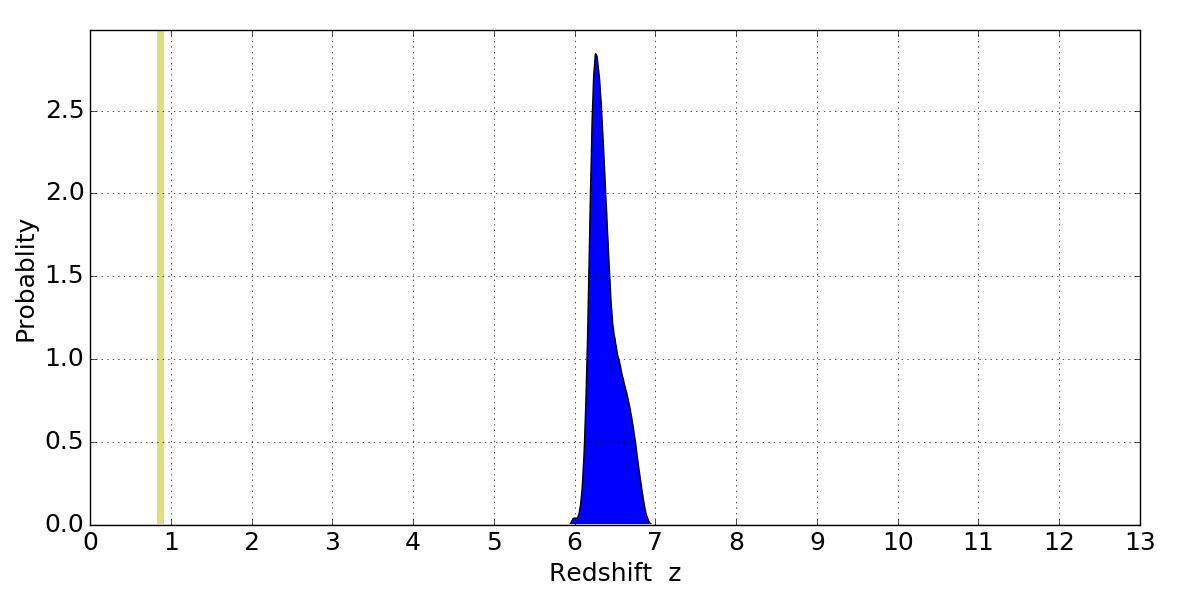 In P(z) plots: Yellow lines mark the cluster redshift z = 0.870,