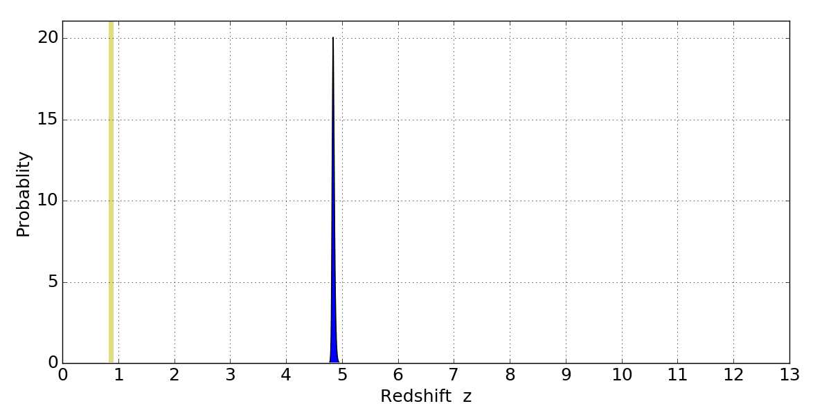 In P(z) plots: Yellow lines mark the cluster redshift z = 0.870,