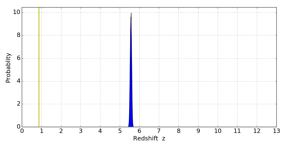 In P(z) plots: Yellow lines mark the cluster redshift z = 0.870,