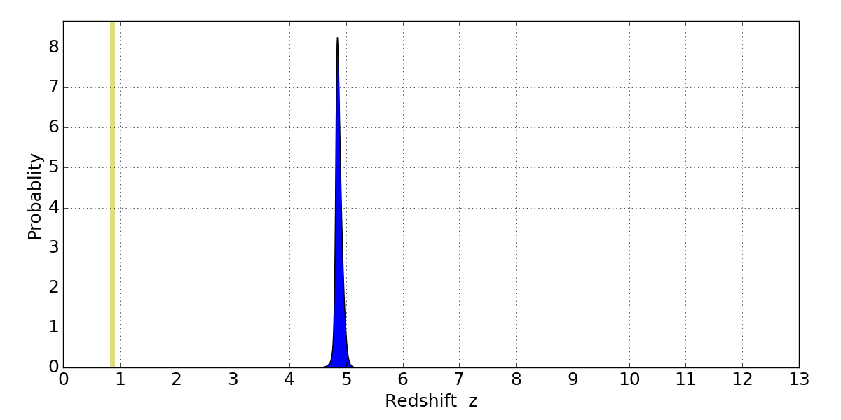 In P(z) plots: Yellow lines mark the cluster redshift z = 0.870,