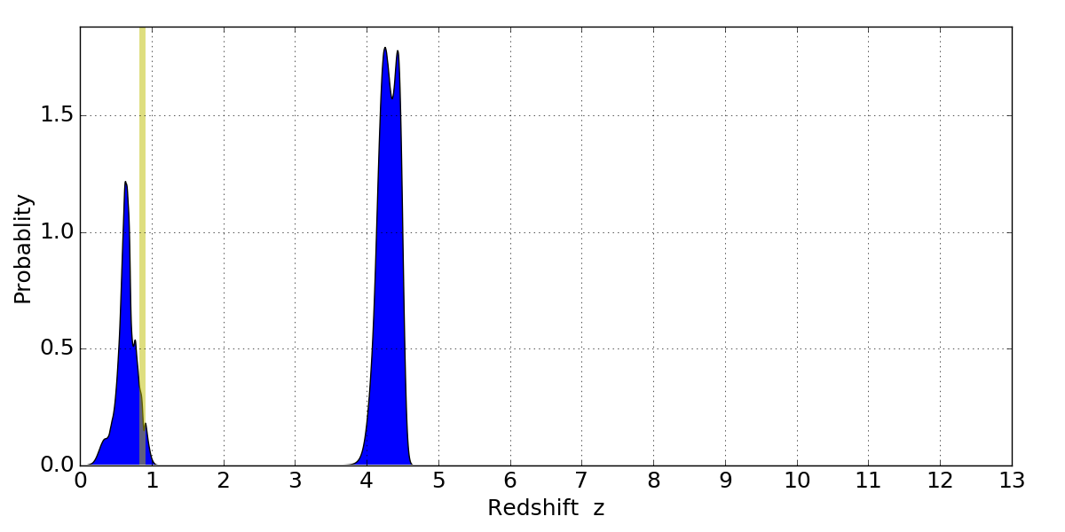 In P(z) plots: Yellow lines mark the cluster redshift z = 0.870,