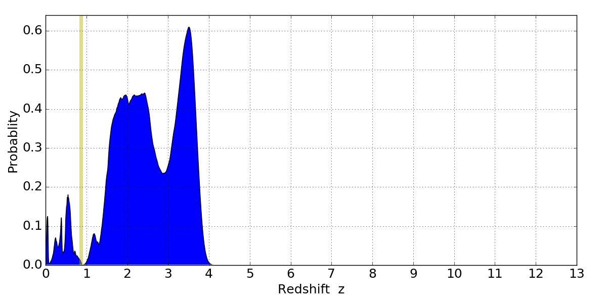 In P(z) plots: Yellow lines mark the cluster redshift z = 0.870,
