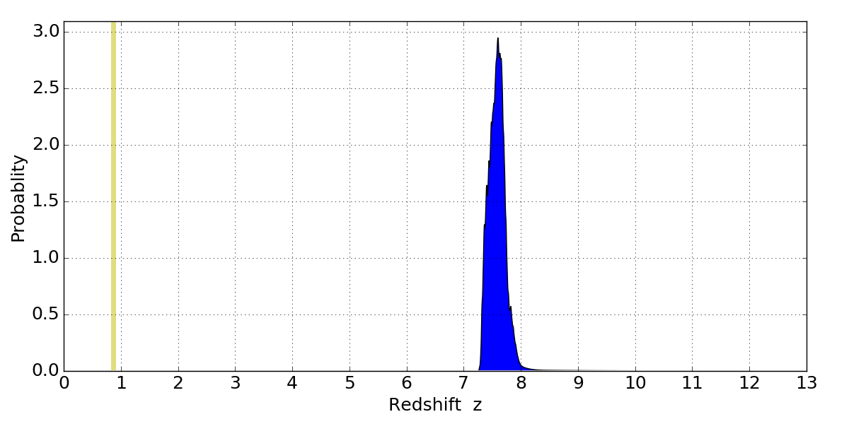 In P(z) plots: Yellow lines mark the cluster redshift z = 0.870,