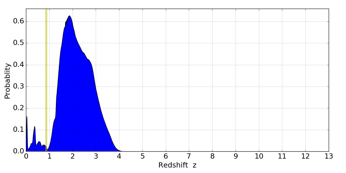 In P(z) plots: Yellow lines mark the cluster redshift z = 0.870,