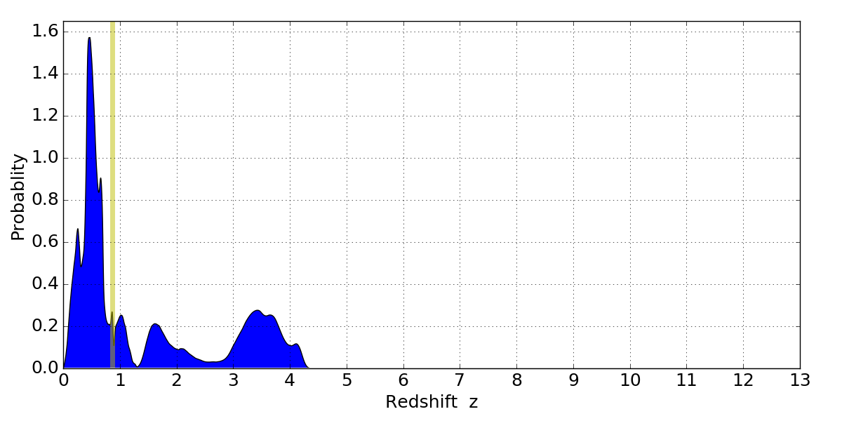 In P(z) plots: Yellow lines mark the cluster redshift z = 0.870,