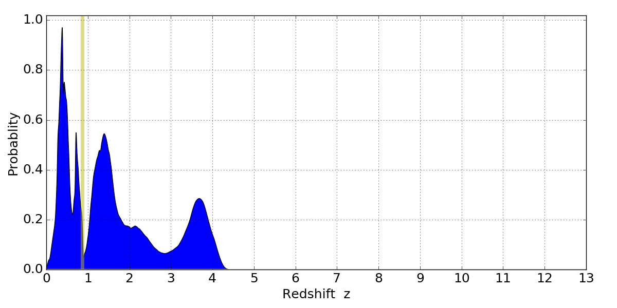 In P(z) plots: Yellow lines mark the cluster redshift z = 0.870,