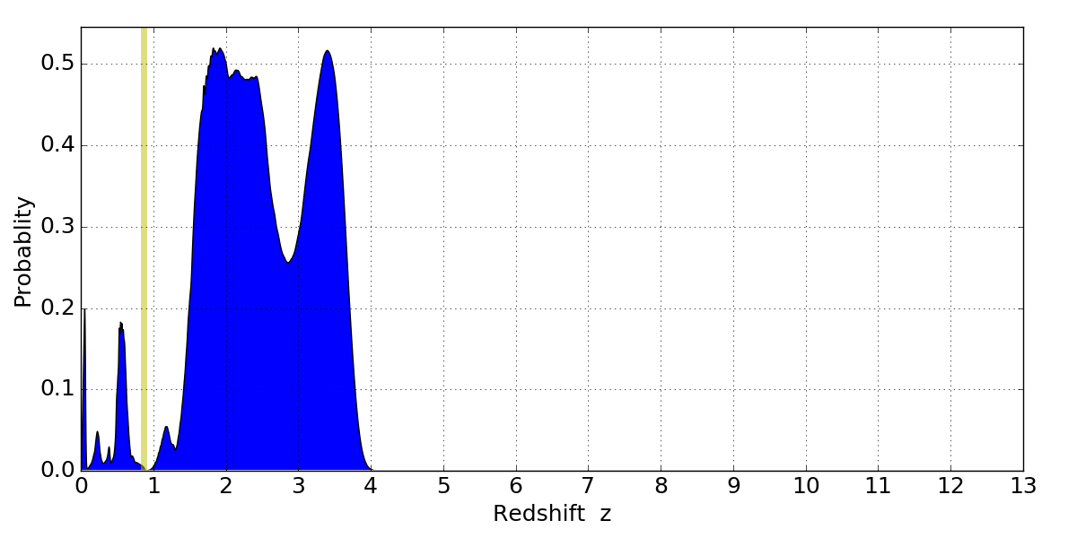 In P(z) plots: Yellow lines mark the cluster redshift z = 0.870,