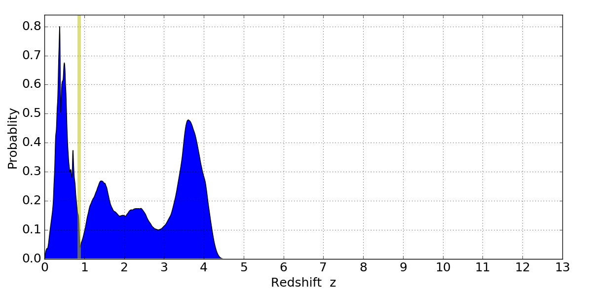 In P(z) plots: Yellow lines mark the cluster redshift z = 0.870,