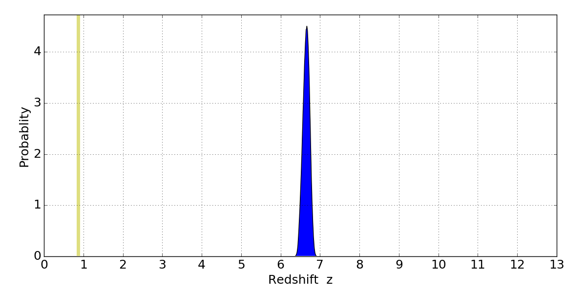 In P(z) plots: Yellow lines mark the cluster redshift z = 0.870,