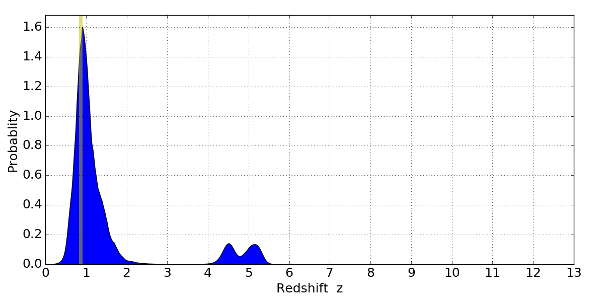 In P(z) plots: Yellow lines mark the cluster redshift z = 0.870,