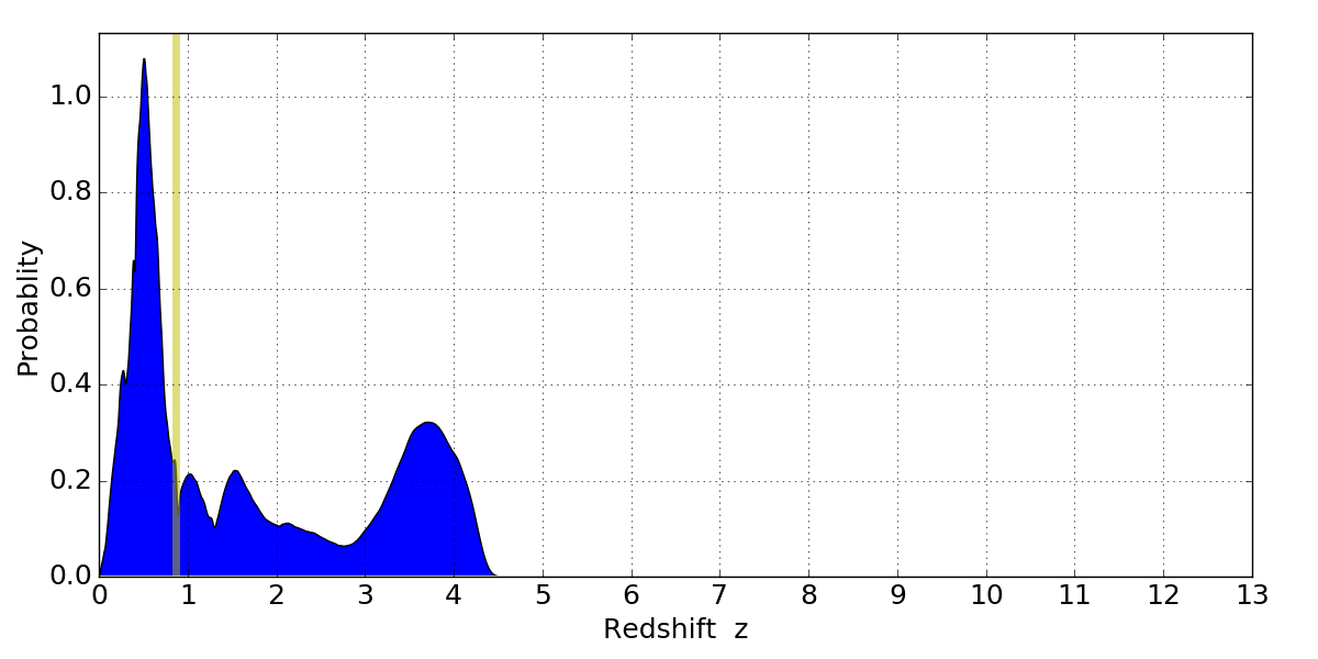 In P(z) plots: Yellow lines mark the cluster redshift z = 0.870,