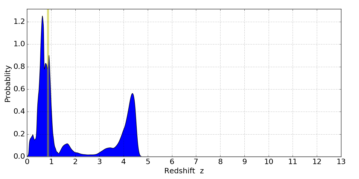 In P(z) plots: Yellow lines mark the cluster redshift z = 0.870,