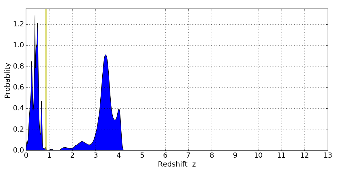 In P(z) plots: Yellow lines mark the cluster redshift z = 0.870,