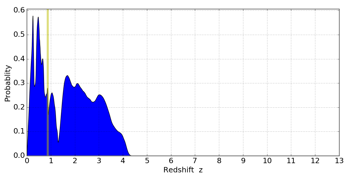 In P(z) plots: Yellow lines mark the cluster redshift z = 0.870,
