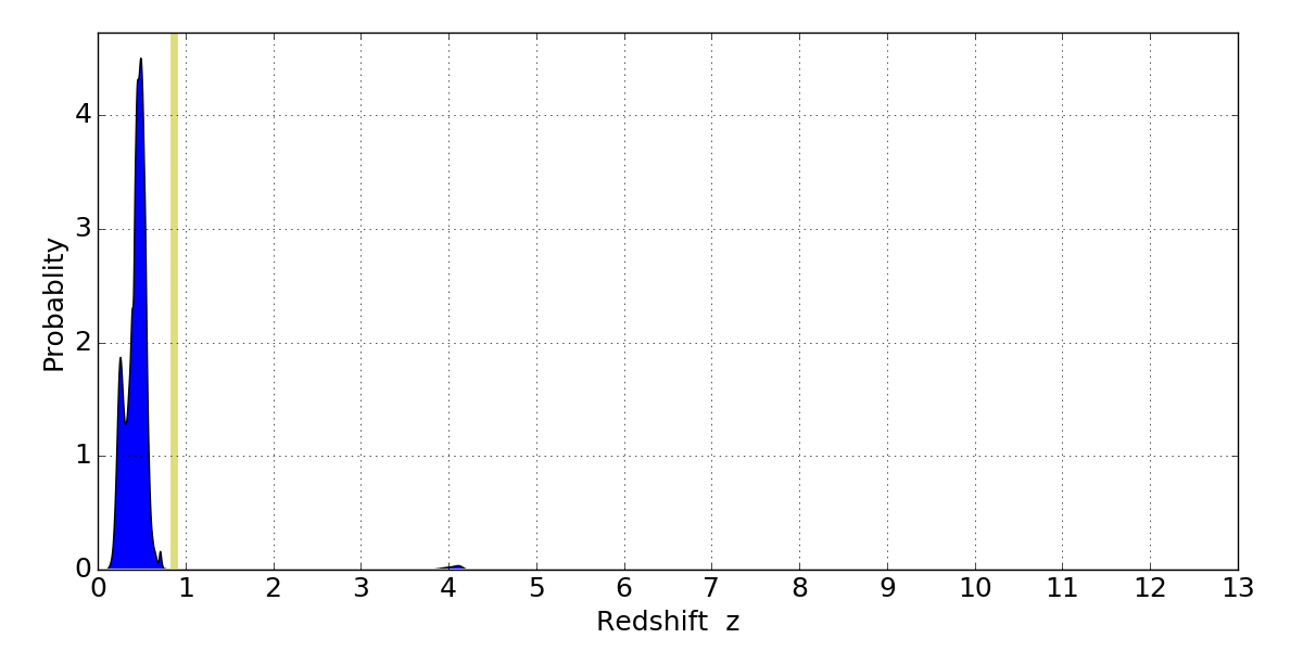 In P(z) plots: Yellow lines mark the cluster redshift z = 0.870,