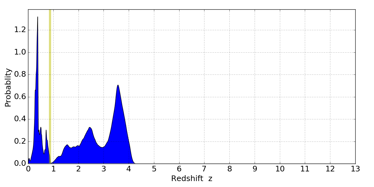 In P(z) plots: Yellow lines mark the cluster redshift z = 0.870,