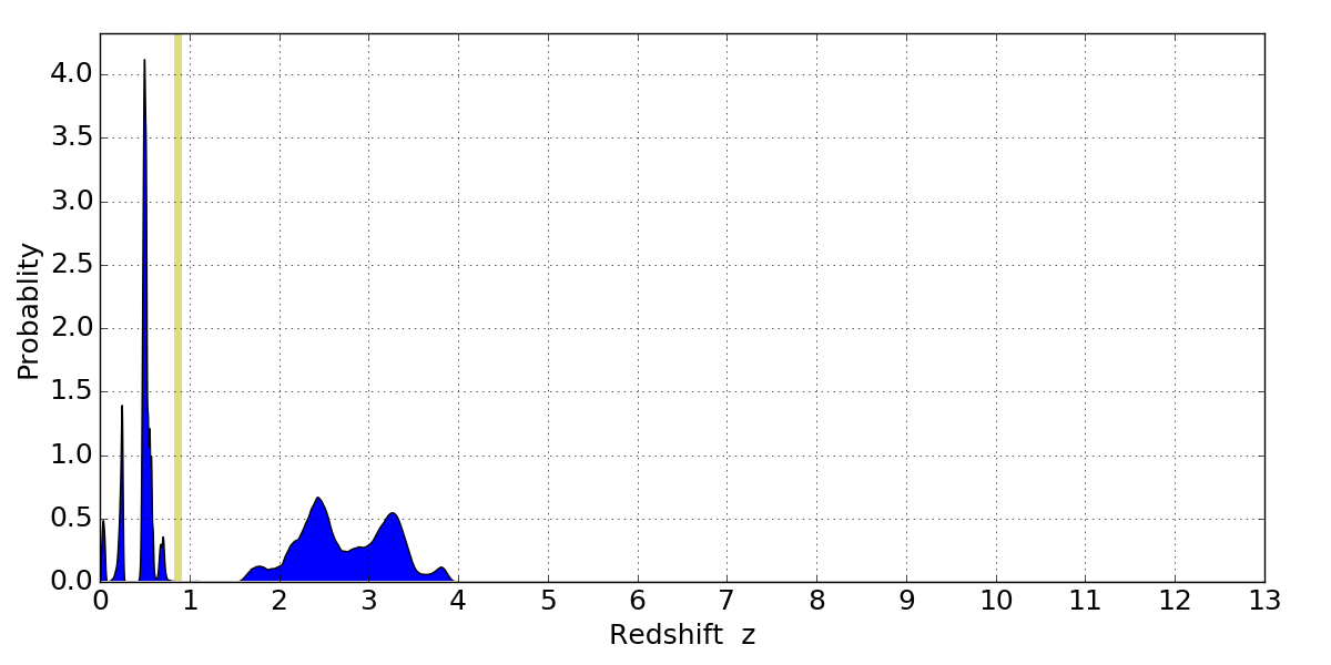 In P(z) plots: Yellow lines mark the cluster redshift z = 0.870,